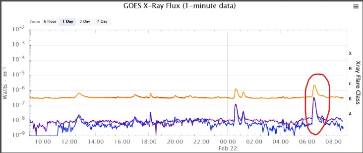 Obrázek zachycuje náhlý nárůst rentgenového toku z GOES kolem 06:00 (spike zakroužkovaný červeně), který dosáhl C‑třídy.